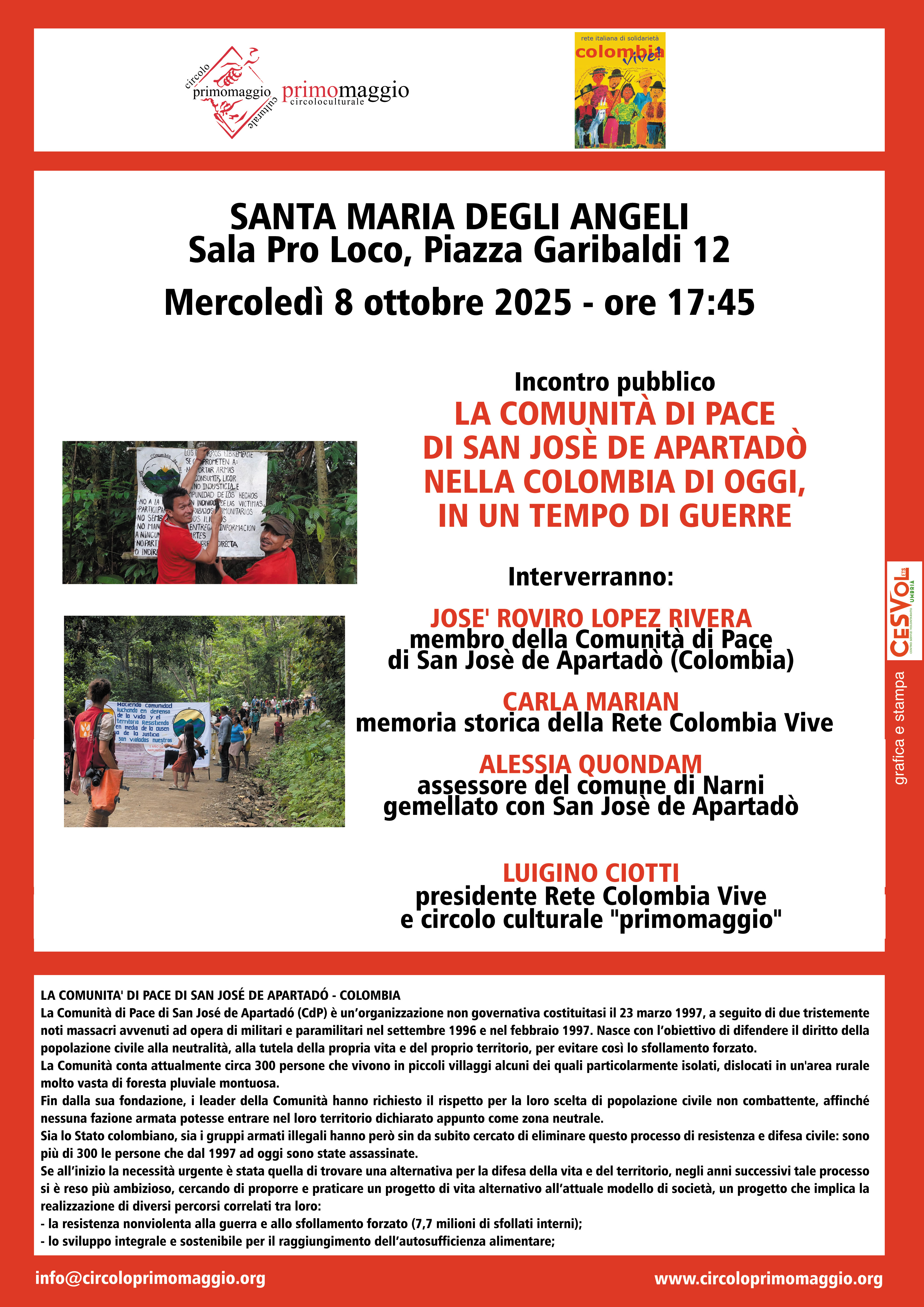 L'incontro è organizzato dall'Anei, sezione di Perugia e delegazione di Assisi, dal Circolo culturale "primomaggio" e dal Piccolo Teatro degli Instabili, con il patrocinio del Comune di Assisi.