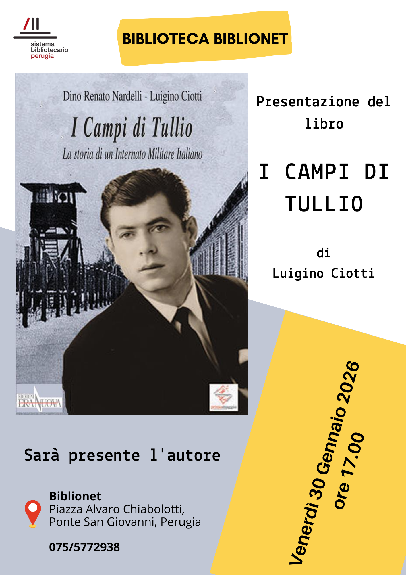 Il 30 gennaio alle ore 17 sono stato invitato da BIBLIONET, la biblioteca comunale di Ponte San Giovanni e, ovviamente, in questo caso l'iniziativa è aperta al pubblico. Luigino Ciotti, presidente del circolo culturale “primomaggio”