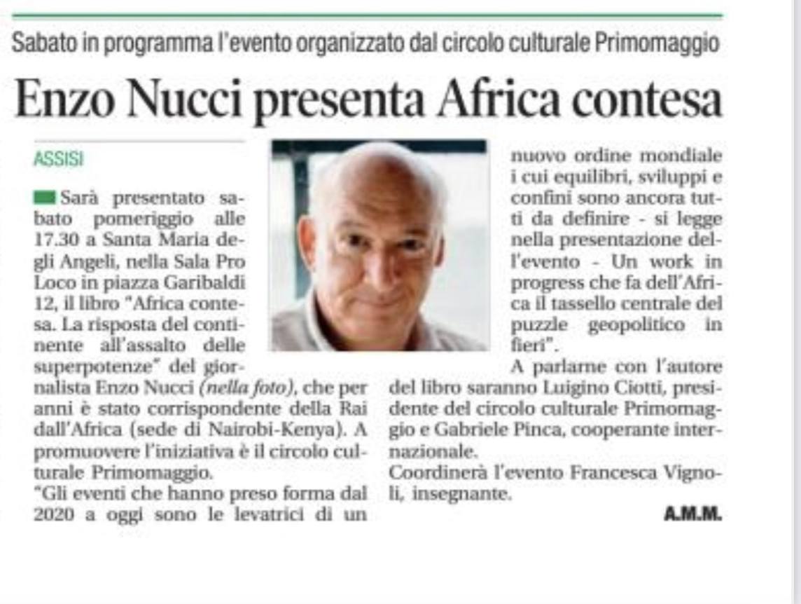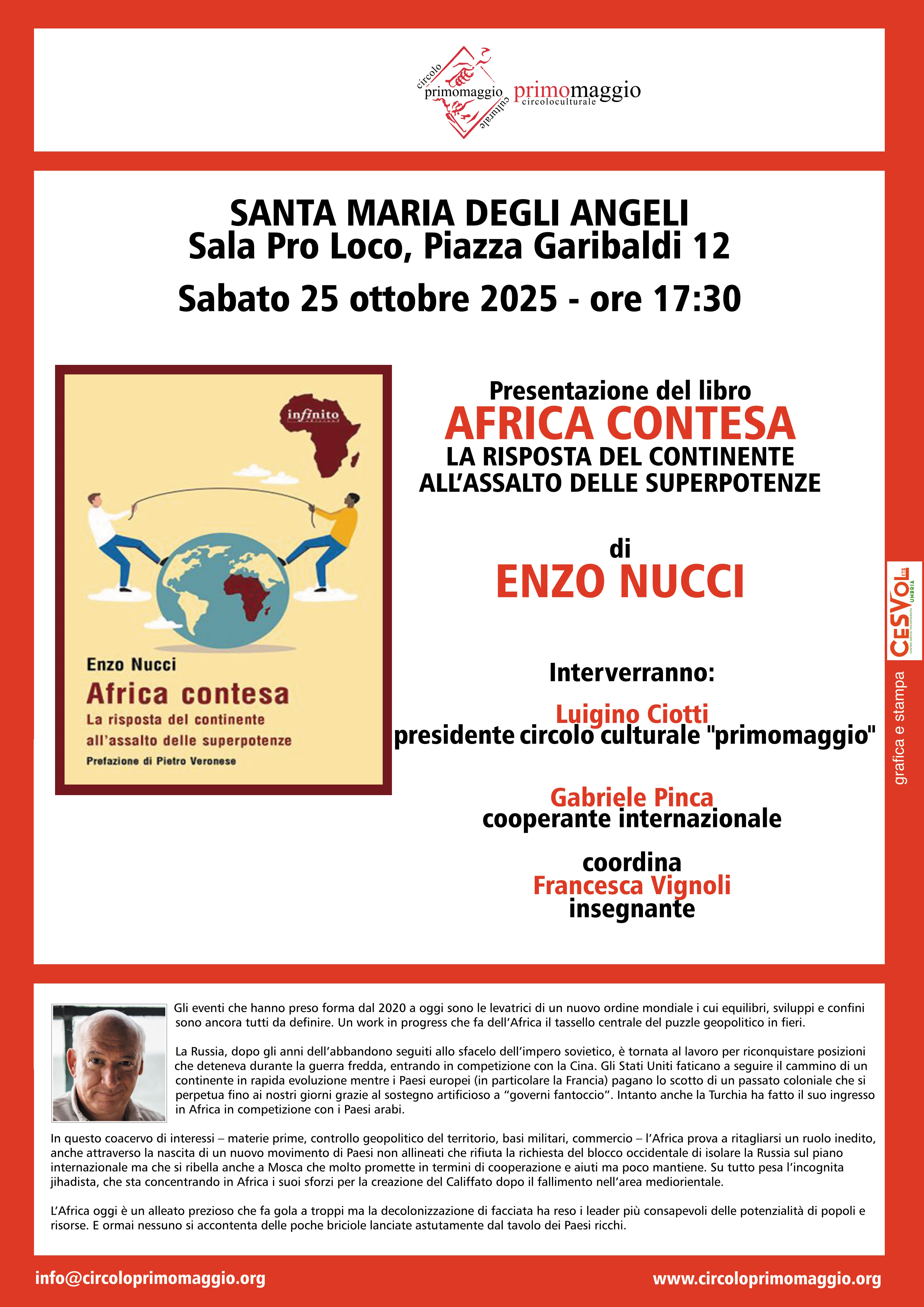 Si svolgerà sabato 25 ottobre 2025 alle ore 17,30 nella Sala Pro Loco a Santa Maria degli Angeli in Piazza Garibaldi 12 la presentazione del libro di Enzo Nucci Africa contesa. La risposta del continente all’assalto delle superpotenze.